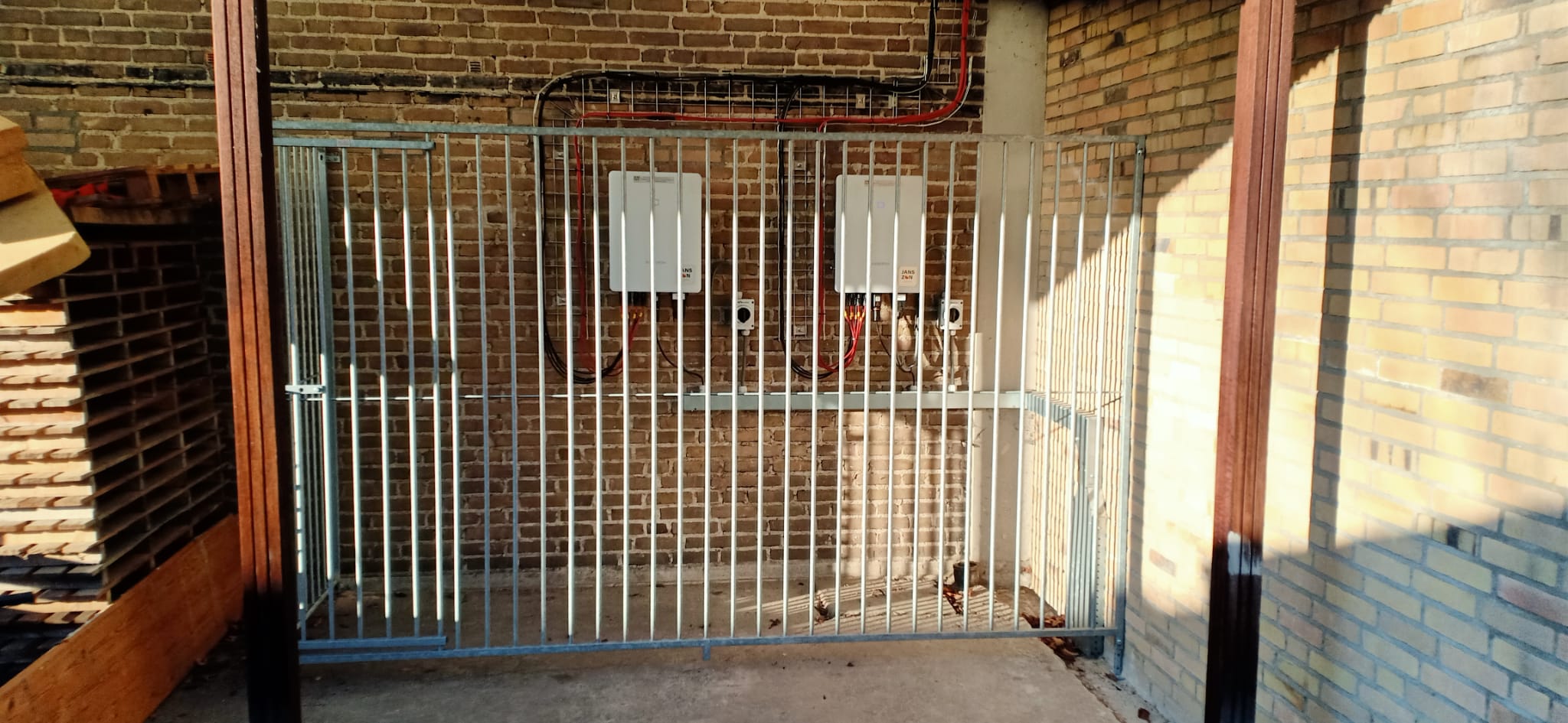 Op het dak van het ROC aan de Erik de Roodestraat in Amsterdam is voor 41 kWp aan panelen geplaatst. Dit is een van de 15 daken waar we samen met Zuiderlicht panelen op gaan plaatsen. De omvormers kwamen aan de kant van het schoolplein te hangen, waardoor er scholieren bij konden komen. Door een simpele oplossing toe te passen - het plaatsen van een hondenkennel om de omvormer locatie - kan de veiligheid van zowel de scholieren als de installatie gewaarborgd worden. Meer lezen over dit project? Kijk dan snel even op de onderstaande link:
